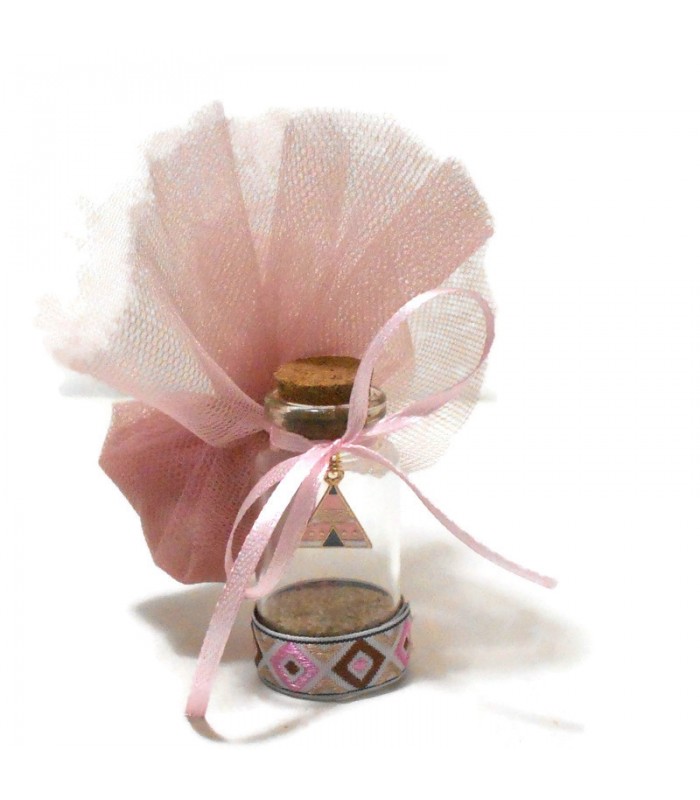 Μπομπονιέρα για κορίτσι με θέμα σκηνή ινδιάνων μικρό γυάλινο μπουκαλάκι με άμμο boho. Η μπομπονιέρα περιλαμβάνει 5 κουφέτα αμυγδάλου με γεύση ή 9 σοκολατένια πολύχρωμα κουφετάκια Χατζηγιαννάκη, κορδέλα και τούλι.