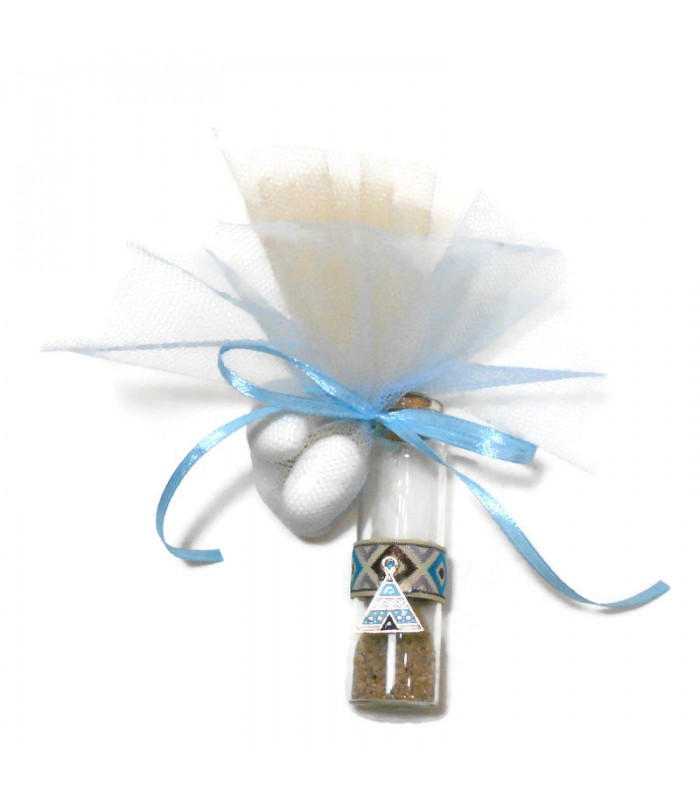 Μπομπονιέρα για αγόρι με θέμα σκηνή ινδιάνων μικρό γυάλινο μπουκαλάκι με άμμο boho. Η μπομπονιέρα περιλαμβάνει 5 κουφέτα αμυγδάλου με γεύση ή 9 σοκολατένια πολύχρωμα κουφετάκια Χατζηγιαννάκη, κορδέλα και τούλι.