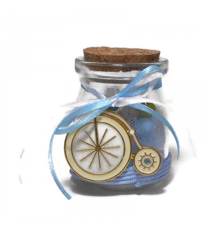 Μπομπονιέρα για αγόρι με θέμα ποδήλατο γυάλινο βαζακι με διακόσμηση. Η μπομπονιέρα περιλαμβάνει 5 κουφέτα αμυγδάλου με γεύση ή 9 σοκολατένια πολύχρωμα κουφετάκια Χατζηγιαννάκη, κορδέλα και τούλι.