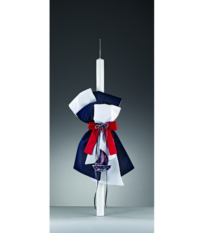 Λαμπάδα βάφτισης με θέμα τη θάλασσα με ξύλινο καράβι για αγόρι, με λευκά, κόκκινα και μπλε υφάσματα.