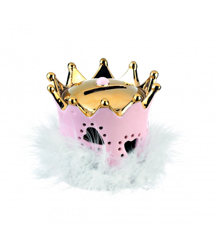Μπομπονιέρα κορώνα κουμπαράς ροζ με πούπουλα MPOB10061