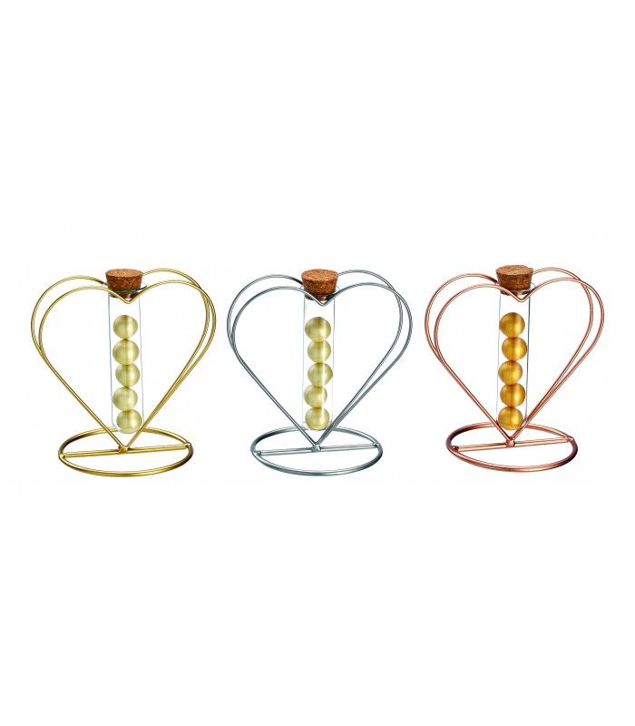 Μπομπονιέρα για γάμο,μεταλλική καρδιά με γυάλινο σωλήνα με φελλό. Διατίθεται σε ασημί, χρυσό και ροζ χρυσό χρώμα της επιλογής σας. Η μπομπονιέρα περιλαμβάνει 5 κουφέτα Χατζηγιαννάκη και κορδέλες.
