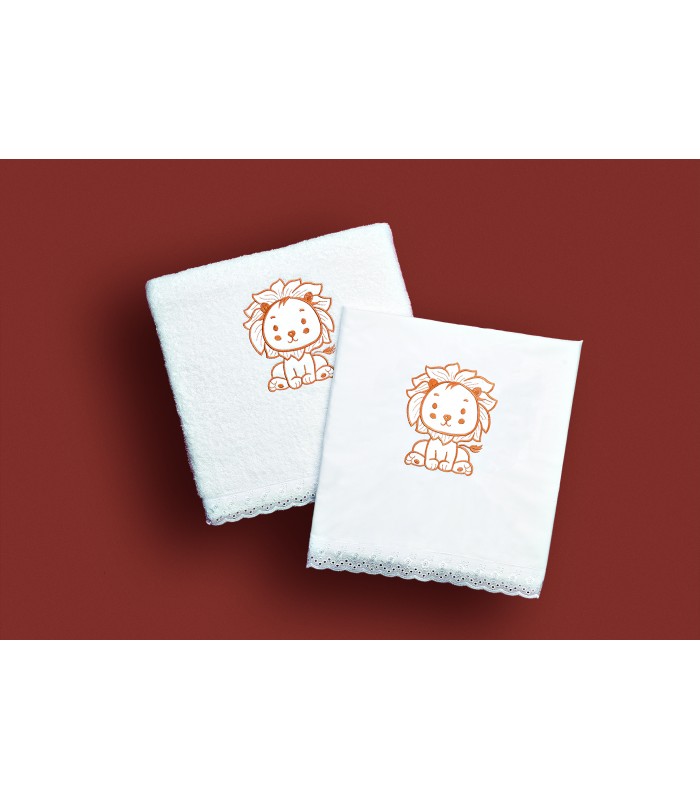 Λαδοσέτ ολοκληρωμένο, με λιοντάρι, βαμβακερό. Το σετ περιλαμβάνει λαδόπανο, μεγάλη πετσέτα, πετσέτα ιερέα και τα εσωρουχάκια του μωρού με το σκουφάκι.