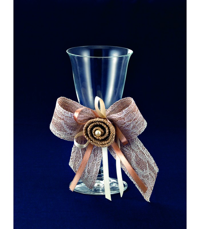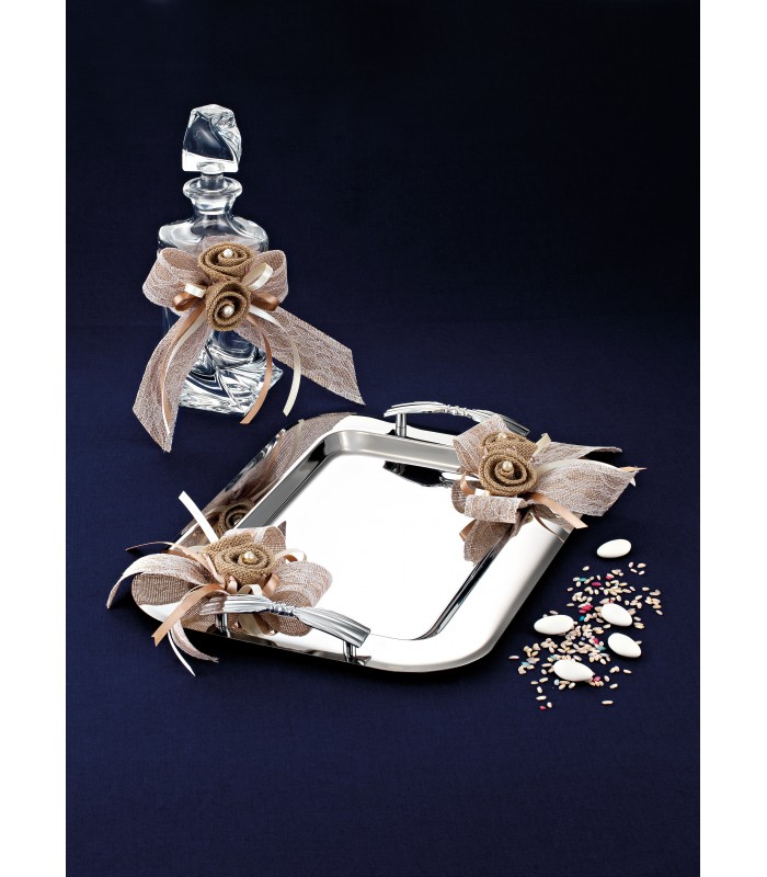 Ολοκληρωμένο Σετ κουμπάρου γάμου που αποτελείται από ανοξείδωτο δίσκο, κρυστάλλινη καράφα και ποτήρι κρασιού κρυστάλλινο, διακοσμημένα με υφασμάτινα λουλούδια.