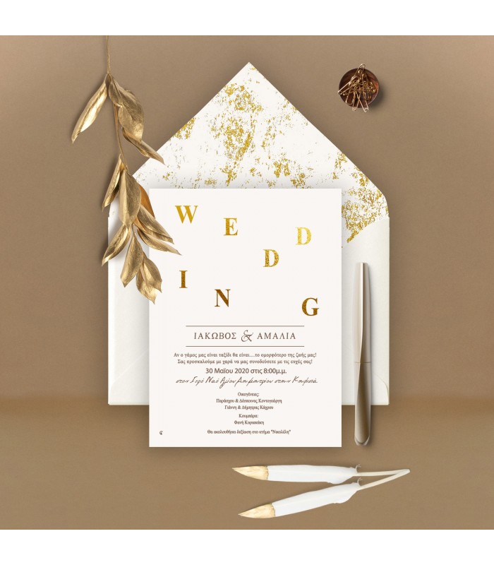 Προσκλητήριο γάμου, η κάρτα του προσκλητηρίου είναι διάστασης 19x14cm. Στη τιμή περιλαμβάνεται η χρυσοτυπία που έχει το προσκλητήριο και ο φάκελος μαζί με την εκτύπωσή του εσωτερικά.