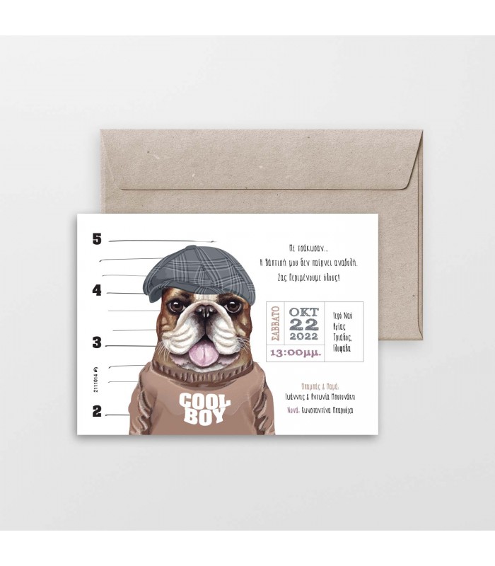 Προσκλητήριο βάπτισης σκύλος για αγόρι. Η κάρτα του προσκλητηρίου έχει διάσταση 19Χ14cm. Στη τιμή περιλαμβάνεται και ο φάκελος.