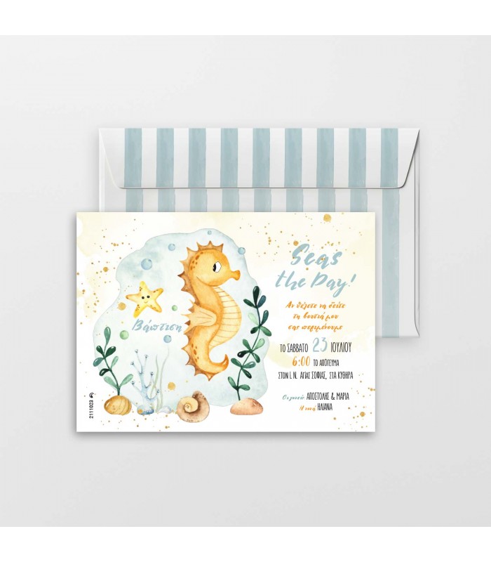 Προσκλητήριο βάπτισης θαλάσσιος ιππόκαμπος. Η κάρτα του προσκλητηρίου έχει διάσταση 19Χ14cm. Στη τιμή περιλαμβάνεται και ο φάκελος.
