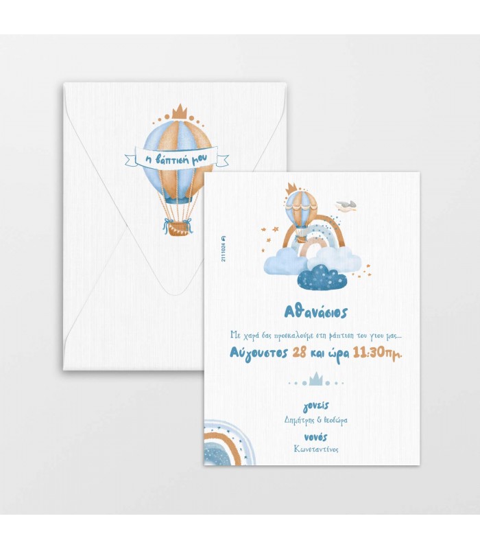 Προσκλητήριο βάπτισης αερόστατο για αγόρι. Η κάρτα του προσκλητηρίου έχει διάσταση 19Χ14cm. Στη τιμή περιλαμβάνεται και ο φάκελος.
