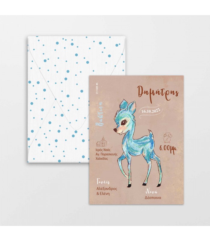 Προσκλητήριο βάπτισης ελαφάκι. Η κάρτα του προσκλητηρίου έχει διάσταση 19Χ14cm. Στη τιμή περιλαμβάνεται και ο φάκελος.