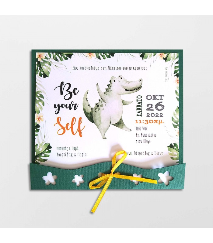 Προσκλητήριο βάπτισης κροκόδειλος για αγόρι. Η κάρτα του προσκλητηρίου έχει διάσταση 19Χ14cm.