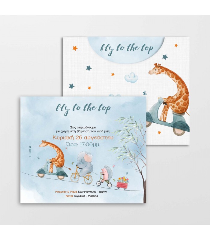 Προσκλητήριο βάπτισης ζωάκια. Η κάρτα του προσκλητηρίου έχει διάσταση 19Χ14cm. Στη τιμή περιλαμβάνεται και ο φάκελος.