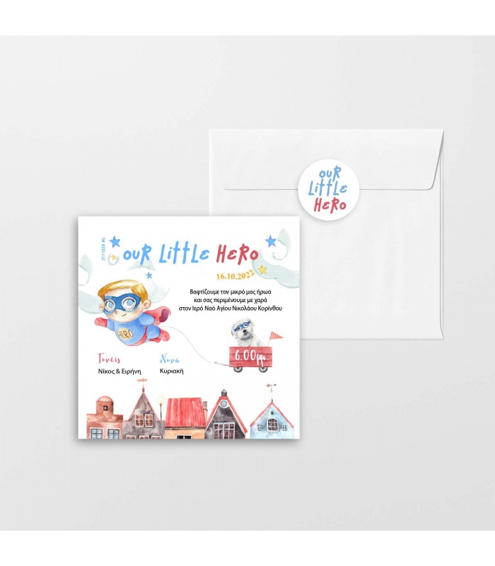 Προσκλητήριο βάπτισης ο μικρός μας ήρωας για αγόρι. Η κάρτα του προσκλητηρίου έχει διάσταση 15.5Χ15.5cm. Στη τιμή περιλαμβάνεται το αυτοκόλλητο και ο φάκελος.