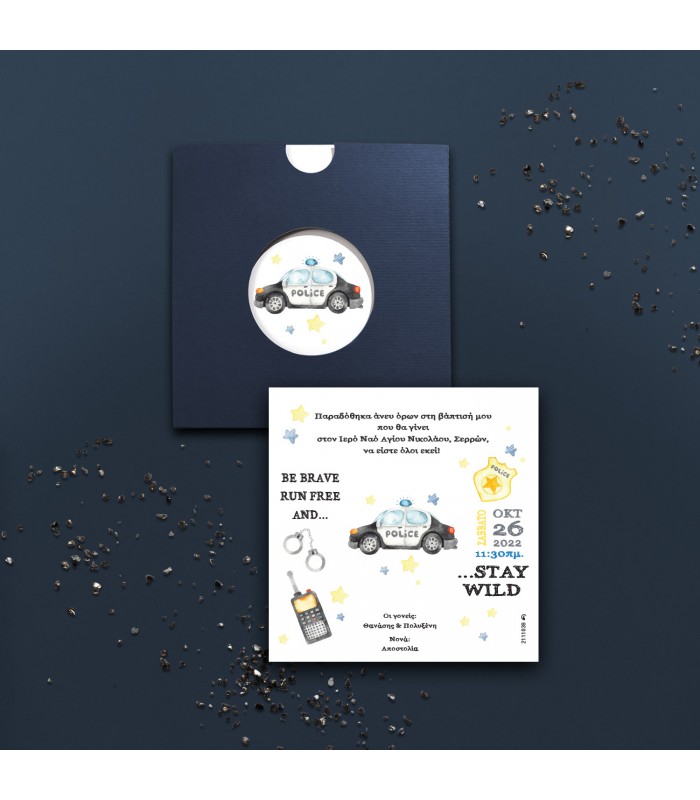 Προσκλητήριο βάπτισης αστυνομία για αγόρι. Η κάρτα του προσκλητηρίου έχει διάσταση 15.5Χ15.5cm. Στη τιμή περιλαμβάνεται και ο φάκελος.