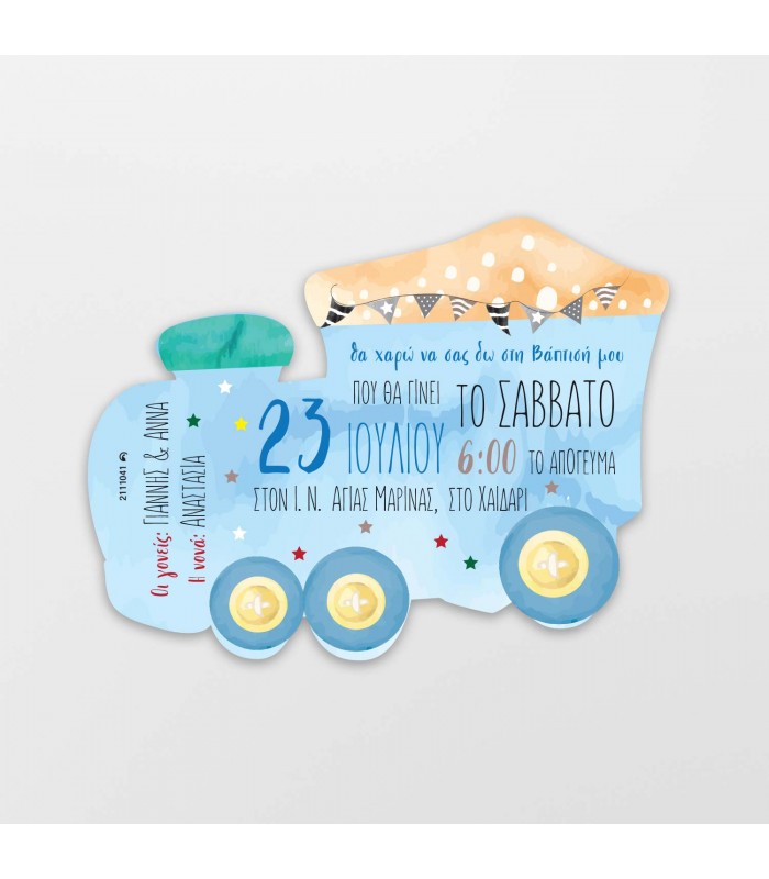Προσκλητήριο βάπτισης τρένο για αγόρι. Η κάρτα του προσκλητηρίου έχει διάσταση 17.5Χ12.5cm.