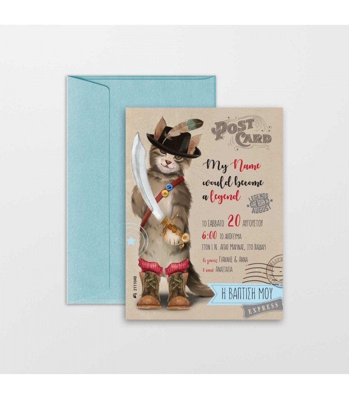 Προσκλητήριο βάπτισης παπουτσωμένος γάτος για αγόρι. Η κάρτα του προσκλητηρίου έχει διάσταση 19Χ14cm. Στη τιμή περιλαμβάνεται και ο φάκελος.