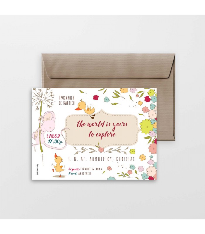 Προσκλητήριο βάπτισης για κορίτσι. Η κάρτα του προσκλητηρίου έχει διάσταση 14Χ19cm. Στη τιμή περιλαμβάνεται ο φάκελος.