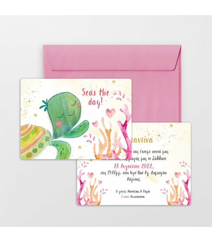 Προσκλητήριο βάπτισης χελωνίτσα για κορίτσι. Η κάρτα του προσκλητηρίου είναι διπλής όψεως και έχει διάσταση 14Χ19cm. Στη τιμή περιλαμβάνεται ο φάκελος.