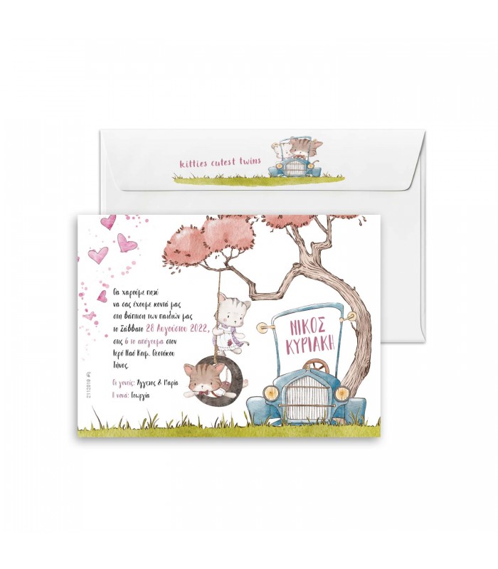 Προσκλητήριο βάπτισης γατάκια για δίδυμα. Η κάρτα του προσκλητηρίου έχει διάσταση 14Χ19cm. Στη τιμή περιλαμβάνεται ο φάκελος.