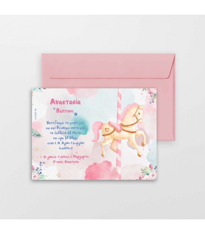 Προσκλητήριο βάπτισης καρουζέλ για κορίτσι. Η κάρτα του προσκλητηρίου έχει διάσταση 19Χ14cm. Στη τιμή περιλαμβάνεται ο φάκελος.