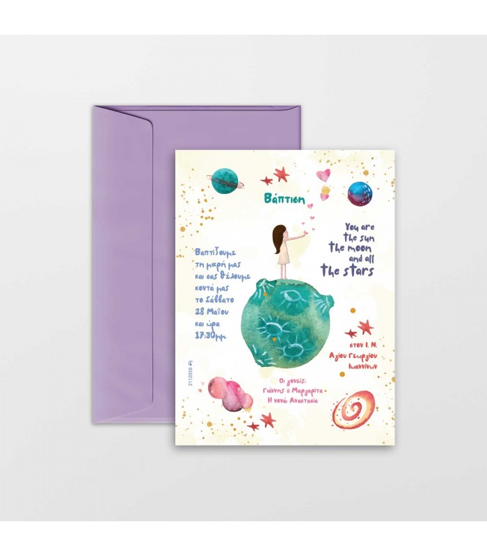 Προσκλητήριο βάπτισης πλανήτης για κορίτσι. Η κάρτα του προσκλητηρίου έχει διάσταση 19Χ14cm. Στη τιμή περιλαμβάνεται ο φάκελος.