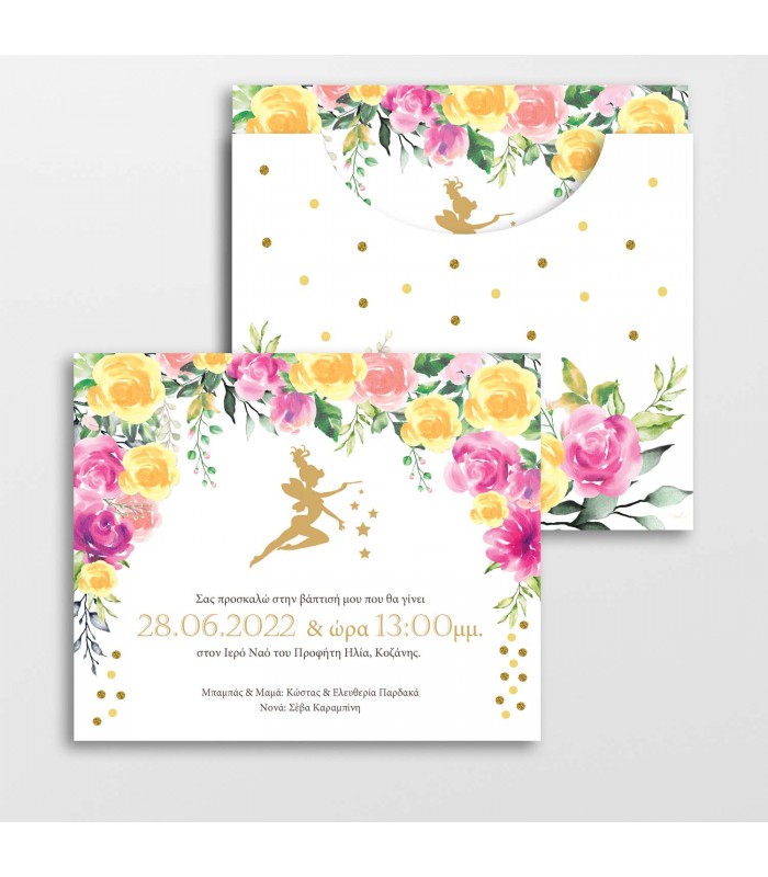 Προσκλητήριο βάπτισης νεράιδα για κορίτσι. Η κάρτα του προσκλητηρίου έχει διάσταση 19Χ16cm. Στη τιμή περιλαμβάνεται ο φάκελος.