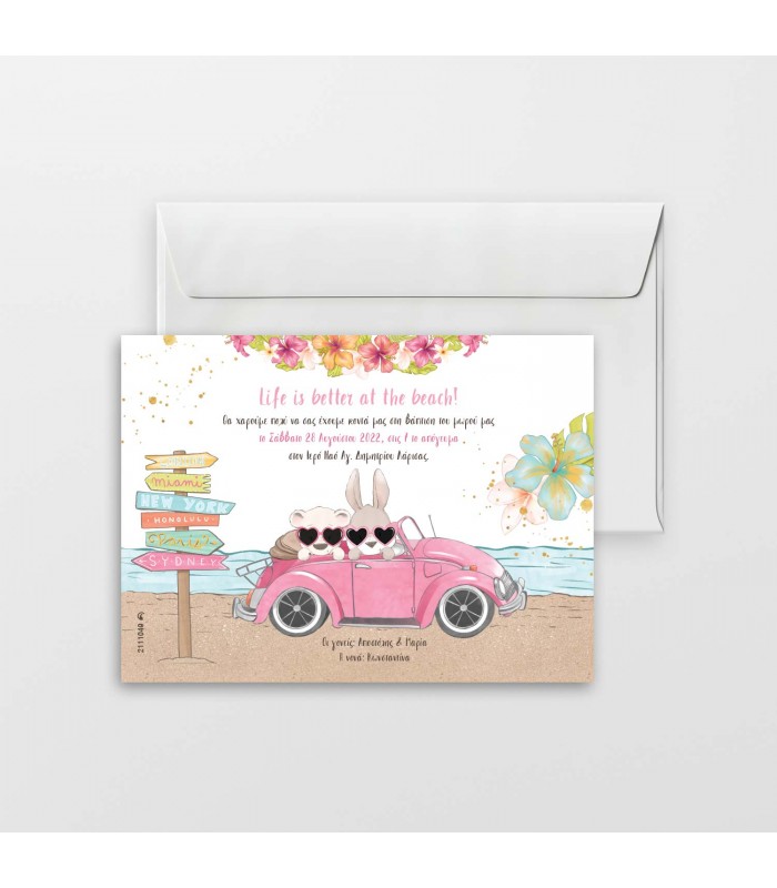 Προσκλητήριο βάπτισης παραλία για κορίτσι. Η κάρτα του προσκλητηρίου έχει διάσταση 19Χ14cm. Στη τιμή περιλαμβάνεται ο φάκελος.