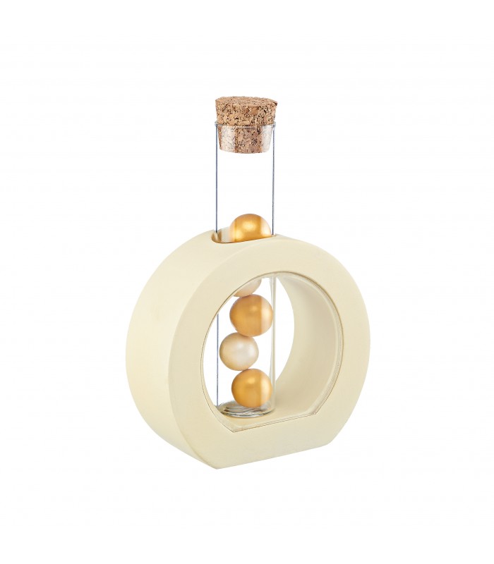 Μπομπονιέρα για γάμο, κεραμικός κύκλος με τρύπα γυάλινο σωλήνα με φελλό διάστασης 12cm. Η μπομπονιέρα περιλαμβάνει 5 κουφέτα Χατζηγιαννάκη και κορδέλες. Η μπομπονιέρα έχει διάσταση 9.5Χ3.5Χ10cm. Ελάχιστη παραγγελία 30 τεμάχια