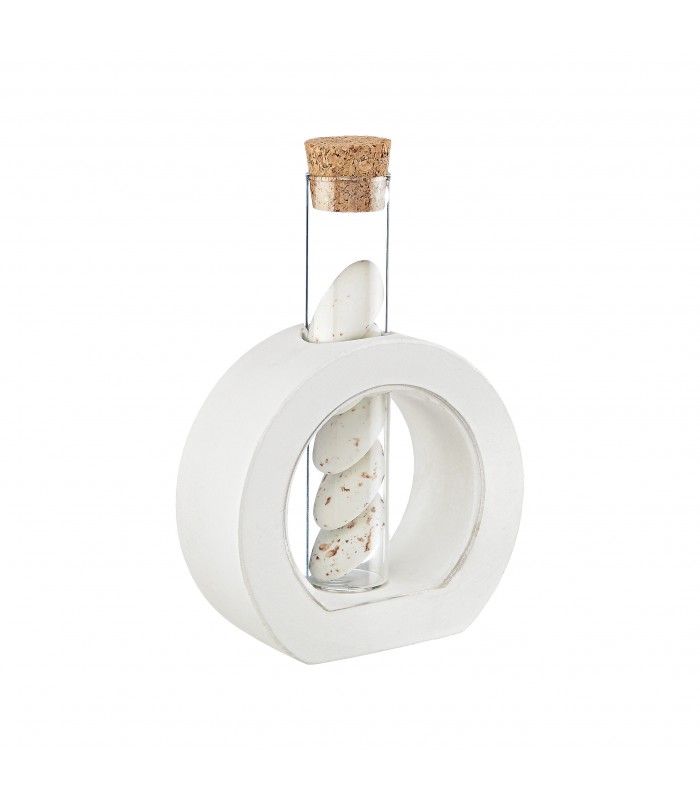 Μπομπονιέρα για γάμο, κεραμικός κύκλος με τρύπα γυάλινο σωλήνα με φελλό διάστασης 12cm. Η μπομπονιέρα περιλαμβάνει 5 κουφέτα Χατζηγιαννάκη και κορδέλες. Η μπομπονιέρα έχει διάσταση 9.5Χ3.5Χ10cm. Ελάχιστη παραγγελία 30 τεμάχια