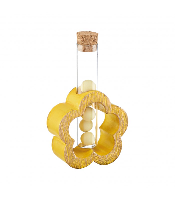 Μπομπονιέρα λουλούδι, κεραμικό με τρύπα γυάλινο σωλήνα με φελλό διάστασης 12cm. Η μπομπονιέρα περιλαμβάνει 5 κουφέτα Χατζηγιαννάκη και κορδέλες. Η μπομπονιέρα έχει διάσταση 8.5Χ3.5Χ8.5cm. Ελάχιστη παραγγελία 30 τεμάχια