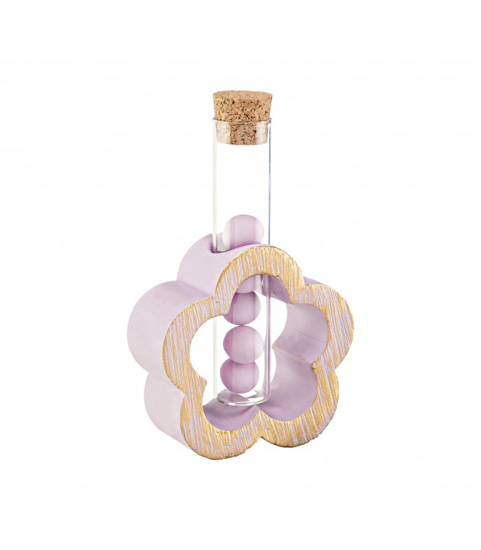Μπομπονιέρα λουλούδι, κεραμικό με τρύπα γυάλινο σωλήνα με φελλό διάστασης 12cm. Η μπομπονιέρα περιλαμβάνει 5 κουφέτα Χατζηγιαννάκη και κορδέλες. Η μπομπονιέρα έχει διάσταση 8.5Χ3.5Χ8.5cm. Ελάχιστη παραγγελία 30 τεμάχια