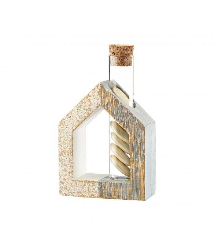 Μπομπονιέρα σπίτι, κεραμικό με τρύπα γυάλινο σωλήνα με φελλό διάστασης 12cm. Η μπομπονιέρα περιλαμβάνει 5 κουφέτα Χατζηγιαννάκη και κορδέλες. Η μπομπονιέρα έχει διάσταση 9Χ3.5Χ11cm. Ελάχιστη παραγγελία 30 τεμάχια