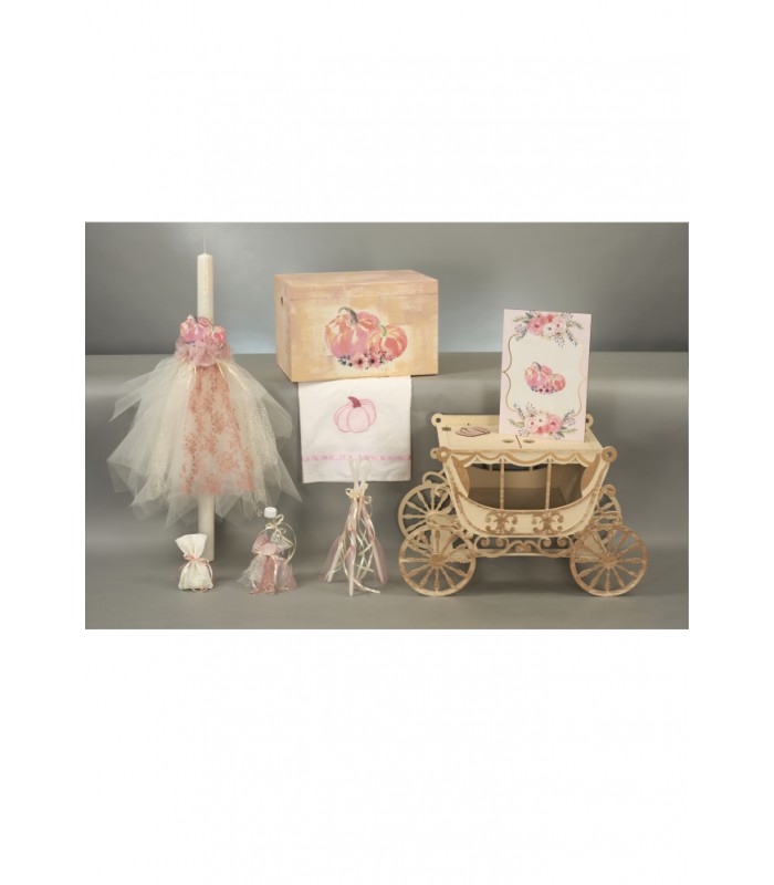Σετ βάφτισης με θέμα κολοκύθα. Στο σετ περιλαμβάνεται λαμπάδα, κουτί ή άμαξα, λαδόπανο, 50 μαρτυρικά και λαδοσέτ (πουγκί με σαπουνάκι, 3 κεράκια, γυάλινο μπουκαλάκι για λάδι).
