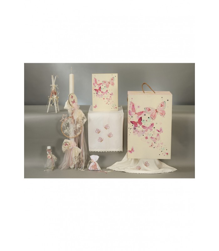 Σετ βάφτισης με θέμα πεταλούδα. Στο σετ περιλαμβάνεται λαμπάδα, κουτί ή βαλίτσα, λαδόπανο, 50 μαρτυρικά και λαδοσέτ (πουγκί με σαπουνάκι, 3 κεράκια, γυάλινο μπουκαλάκι για λάδι).