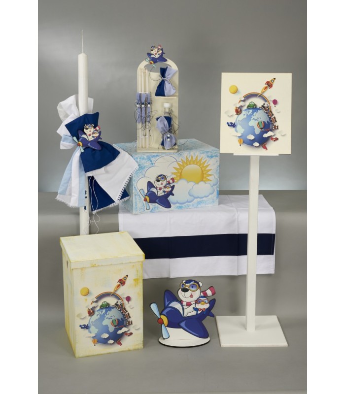 Σετ βάφτισης με θέμα αεροπλανάκι και υδρόγειο. Στο σετ περιλαμβάνεται λαμπάδα, κουτί με επιλογή σε δύο διαφορετικά σχέδια, λαδόπανο, 50 μαρτυρικά και λαδοσέτ (πουγκί με σαπουνάκι, 3 κεράκια, γυάλινο μπουκαλάκι για λάδι).
