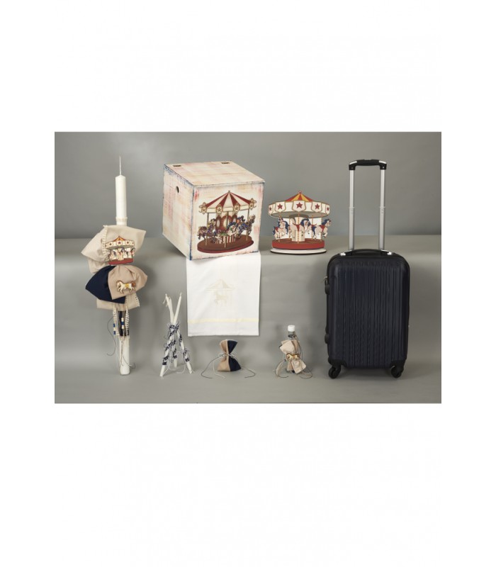 Σετ βάφτισης με θέμα καρουζέλ. Στο σετ περιλαμβάνεται λαμπάδα, κουτί ή βαλίτσα, λαδόπανο, 50 μαρτυρικά και λαδοσέτ (πουγκί με σαπουνάκι, 3 κεράκια, γυάλινο μπουκαλάκι για λάδι).