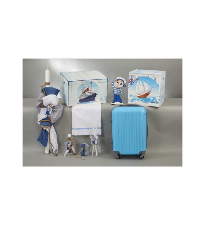Σετ βάφτισης με θέμα ναυτάκι και καράβι. Στο σετ περιλαμβάνεται λαμπάδα, κουτί ανάμεσα σε επιλογή δύο σχεδίων ή βαλίτσα, λαδόπανο, 50 μαρτυρικά και λαδοσέτ (πουγκί με σαπουνάκι, 3 κεράκια, γυάλινο μπουκαλάκι για λάδι).