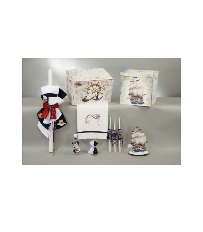Σετ βάφτισης με θέμα καράβι και θάλασσα. Στο σετ περιλαμβάνεται λαμπάδα, κουτί ανάμεσα σε δύο επιλογές σχεδίων, λαδόπανο, 50 μαρτυρικά και λαδοσέτ (πουγκί με σαπουνάκι, 3 κεράκια, γυάλινο μπουκαλάκι για λάδι).