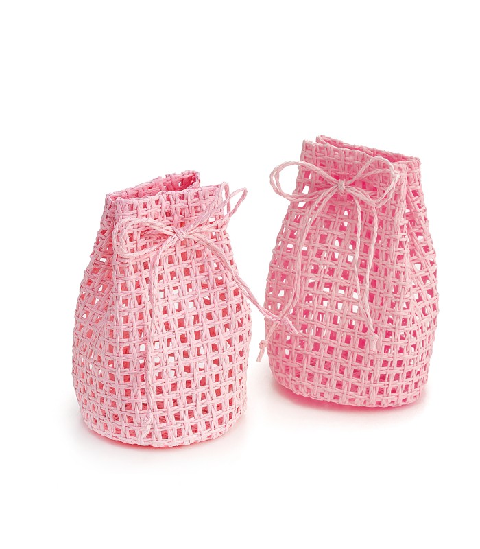 Μπομπονιέρα για βάφτιση πουγκί ροζ από λινάτσα. Η μπομπονιέρα περιλαμβάνει 5 κουφέτα αμυγδάλου Χατζηγιαννάκη και τούλι. Διάσταση 7Χ12cm.