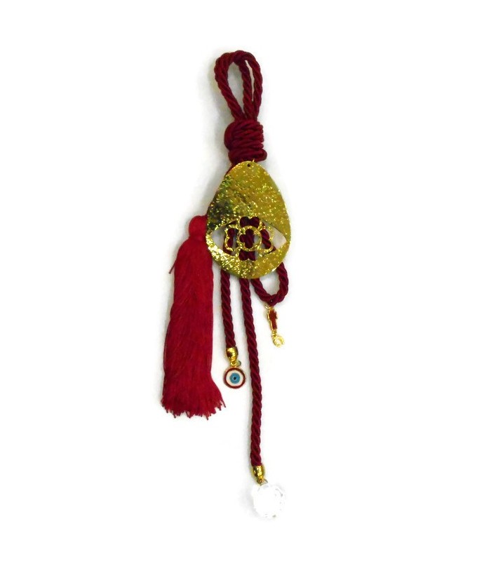 Γούρι πασχαλινό αβγό απο ορείχαλκο με διάτρητα σχέδια ματι πάνω σε κοκκινο κορδόνι με κρεμαστά σταυρό ,πεταλο,κρυσταλλακι λευκό και μάτι.Διάσταση αβγού 10cm,ολοκληρο το γούρι εχει διάσταση 40cm.