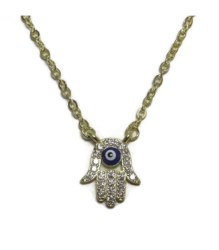 Επιχρυσωμένο κολιέ χέρι τύχης από ασήμι 925 με λευκές πέτρες ζιργκόν και ματάκι με σμάλτο. Η διάσταση της αλυσίδας είναι 40 - 43cm.