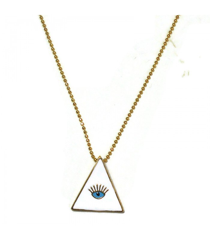 Χειροποίητο μεταλλικό κολιέ με επιχρυσωμένο μάτι με βλεφαρίδες με λευκό σμάλτο με αλυσίδα. Διάσταση 65cm.