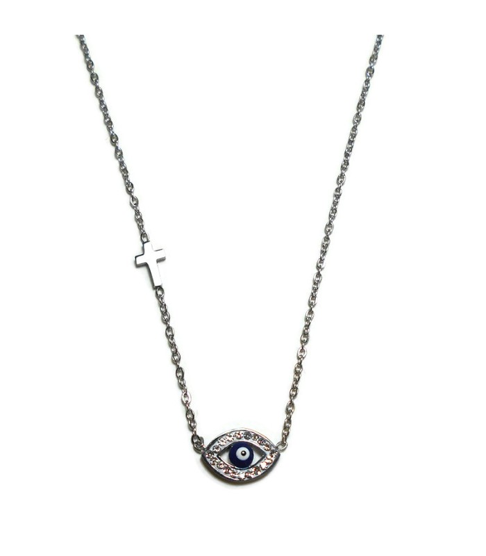 Κολιέ μάτι και σταυρουδάκι με πέτρες ζιργκόν από ανοξείδωτο ατσάλι, σε αλυσίδα 40-45 cm. Δεν μαυρίζουν και δεν προκαλούν αλλεργίες.