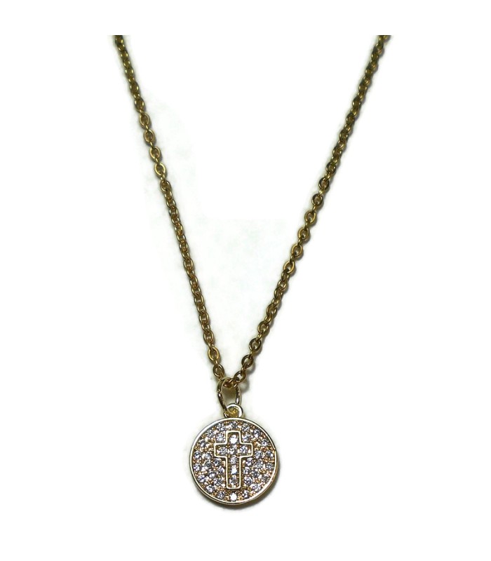 Κολιέ σταυρός με πέτρες ζιργκόν από επιχρυσωμένο ανοξείδωτο ατσάλι, σε αλυσίδα 40-45 cm. Δεν μαυρίζουν και δεν προκαλούν αλλεργίες.