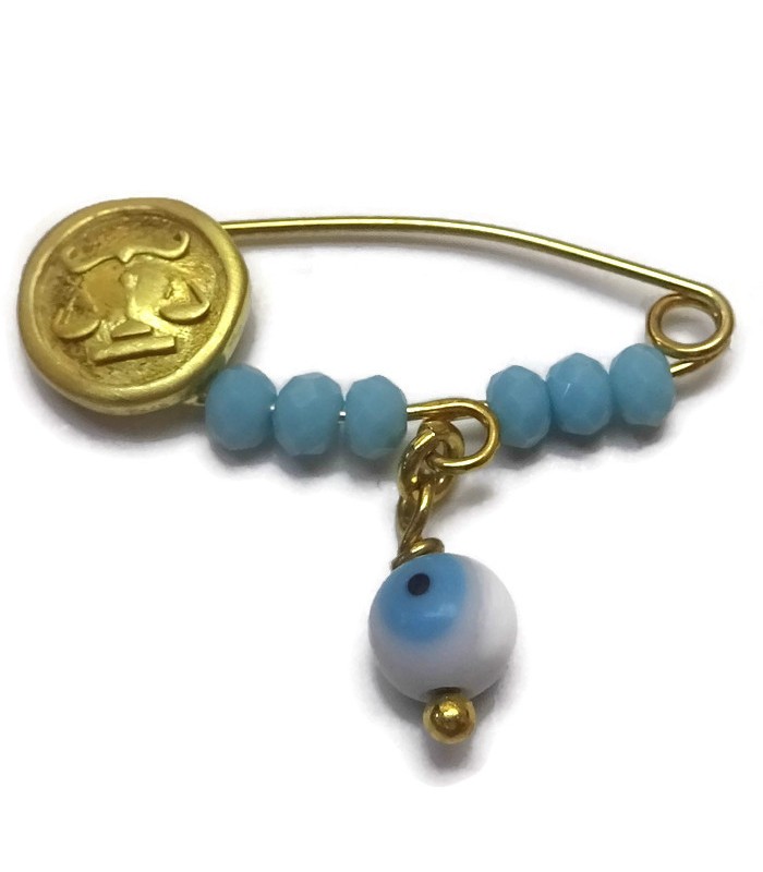 Παιδική παραμάνα φυλαχτό απο ασήμι 925 επιχρυσωμένη ζώδιο Ζυγός για νεογέννητο αγοράκι με ματάκι και γαλάζιες πέτρες πανω σε υφασματινο μπλουζάκι. Ζώδιο Ζυγός 23/9-22/10.