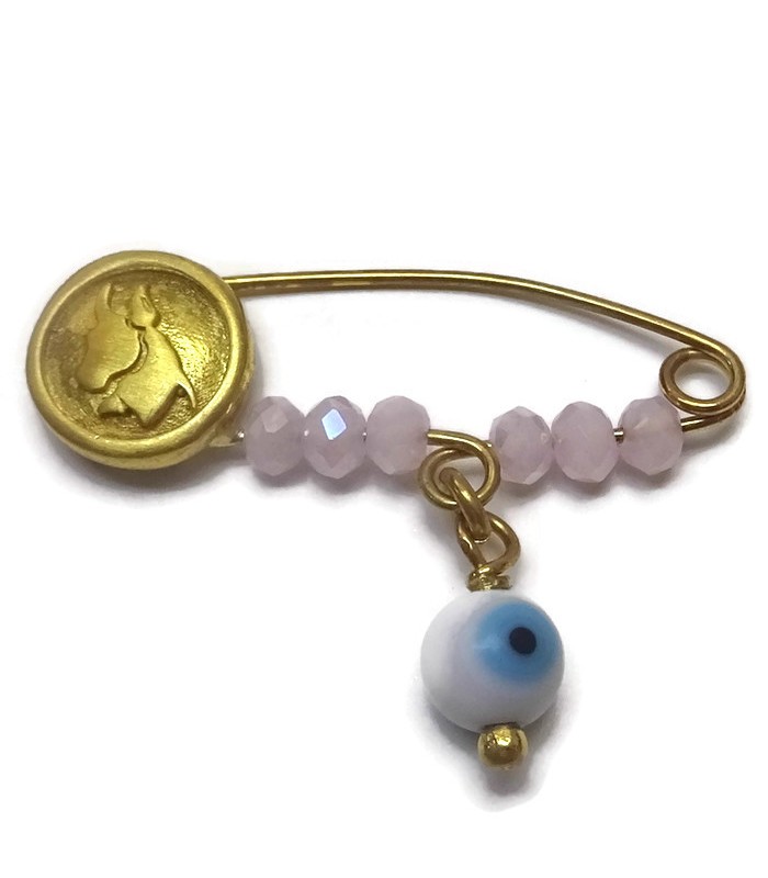 Παιδική παραμάνα φυλαχτό απο ασήμι 925 επιχρυσωμένο ζώδιο Ταύρος για νεογέννητο κοριτσάκι με ματάκι και ροζ πέτρες πανω σε υφασματινο μπλουζάκι. Ζώδιο Ταύρος 21/4-20/5.