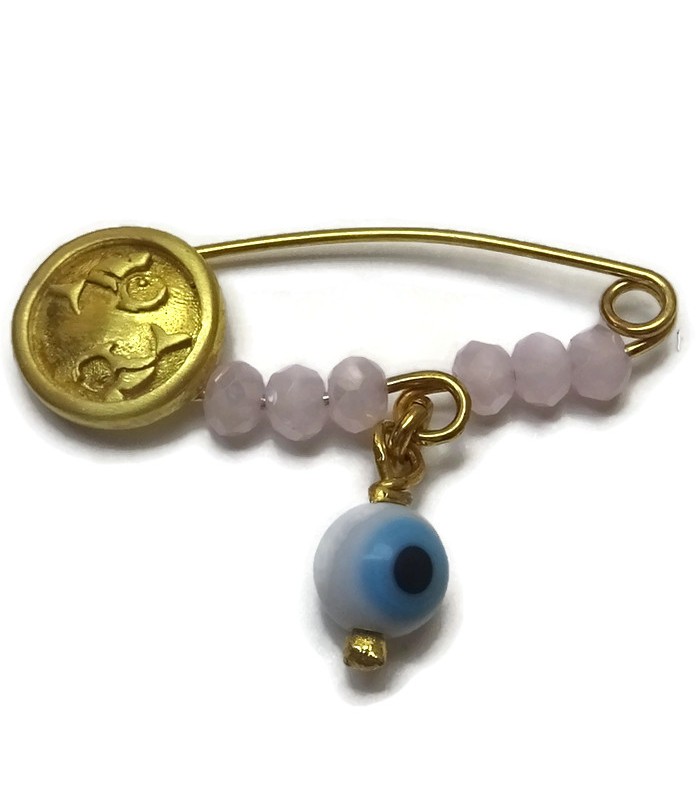 Παιδική παραμάνα φυλαχτό απο ασήμι 925 επιχρυσωμένο ζώδιο Ιχθείς για νεογέννητο κοριτσάκι με ματάκι και ροζ πέτρες πανω σε υφασματινο μπλουζάκι. Ζώδιο Ιχθείς 20/2-20/3.